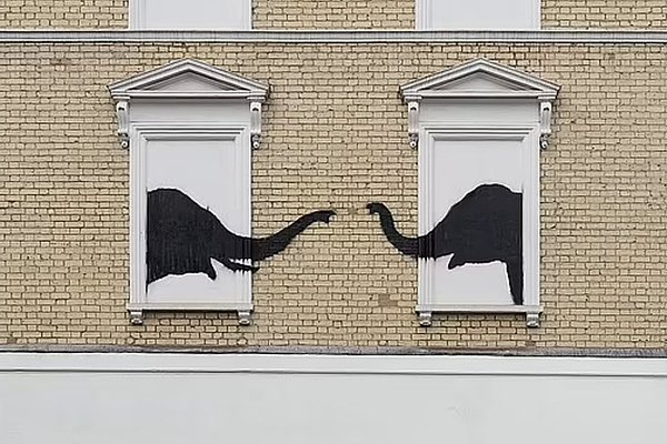 Новая работа Бэнкси представляет собой двух черных слонов, нарисованных на окнах одного из лондонских домов, которые тянутся друг к другу хоботами.
